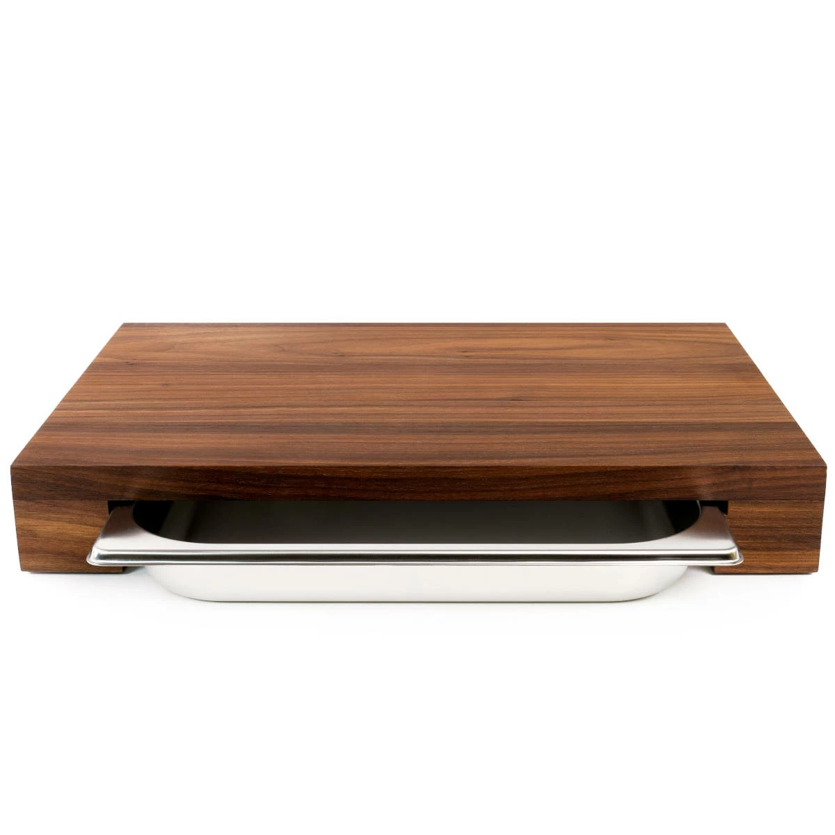 Das Schneidebrett besteht aus , was für eine warme Optik sorgt und gleichzeitig Stabilität und Belastbarkeit garantiert. Die wird leichtgängig wie eine Schublade nach hinten und vorne herausgeschoben. Schält Obst und Gemüse, schneidet Euer Brot oder zerlegt Geflügel auf dem massiven Walnuss-Holzbrett, das Euch eine mit einer Größe von bietet. Alle Abfälle und Brotkrümel schiebt Ihr einfach in die Auffangwanne und schon sind sie aus dem Weg. Die Auffangwanne aus Edelstahl ist für die Spülmaschine geeignet.