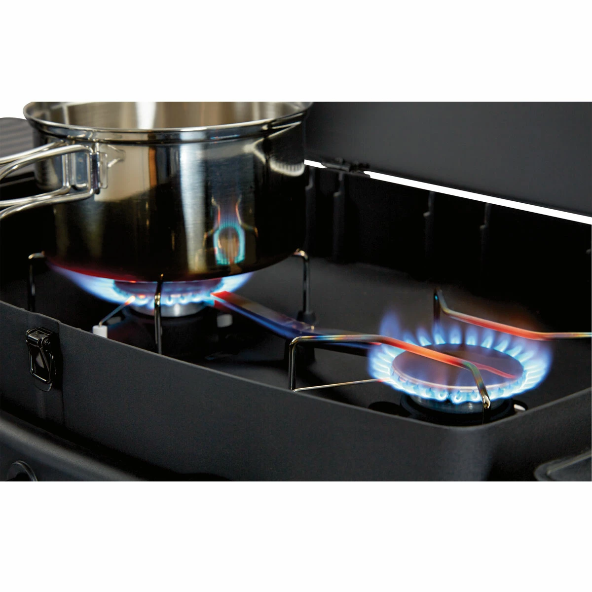 Auf dem lässt es sich dabei ganz komfortabel und in angenehmer Arbeitshöhe grillen. Mit dem cleveren Schiebesystem ist der tragbare Grill ganz einfach, schnell und sicher mit dem Trolley verbunden und wieder getrennt.
