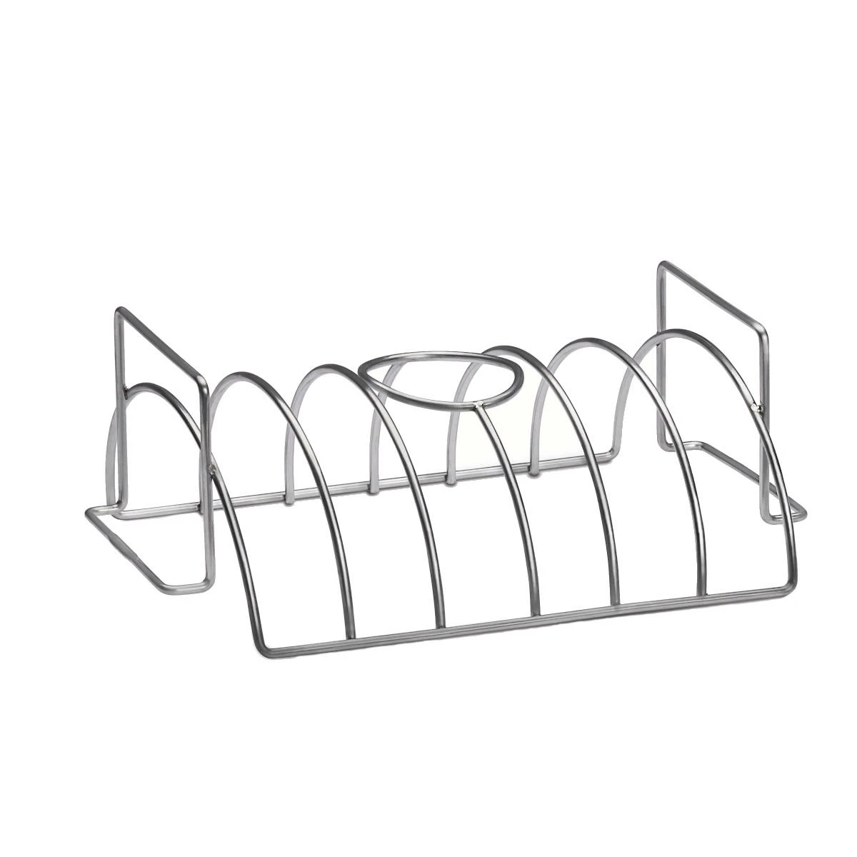 Reihum finden sechs Rib-Reihen platz. Oder doch lieber ein saftiger Braten? Der findet in der Wölbung den idealen Grillplatz! Eine runde Öffnung in der Mitte des Multifunktionalen Halters bietet Gelegenheit für ein Bierdosen-Hähnchen. Einfach eine Bierdose öffnen, in die Rundung einsetzen und ein ganzes Hähnchen darüber stülpen. So aromatisch haben Sie noch nie Hähnchen erlebt!