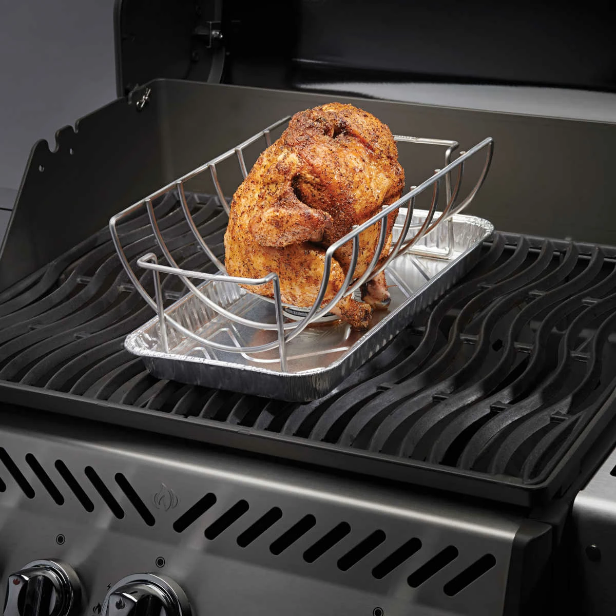 Um die intensiven Fleischsäfte aufzufangen, empfehlen wir die exakt passenden Napoleon Alutassen #62008. Der 3 in 1 Multifunktionskorb für Braten, Ribs und Hähnchen ist aus Edelstahl geferti