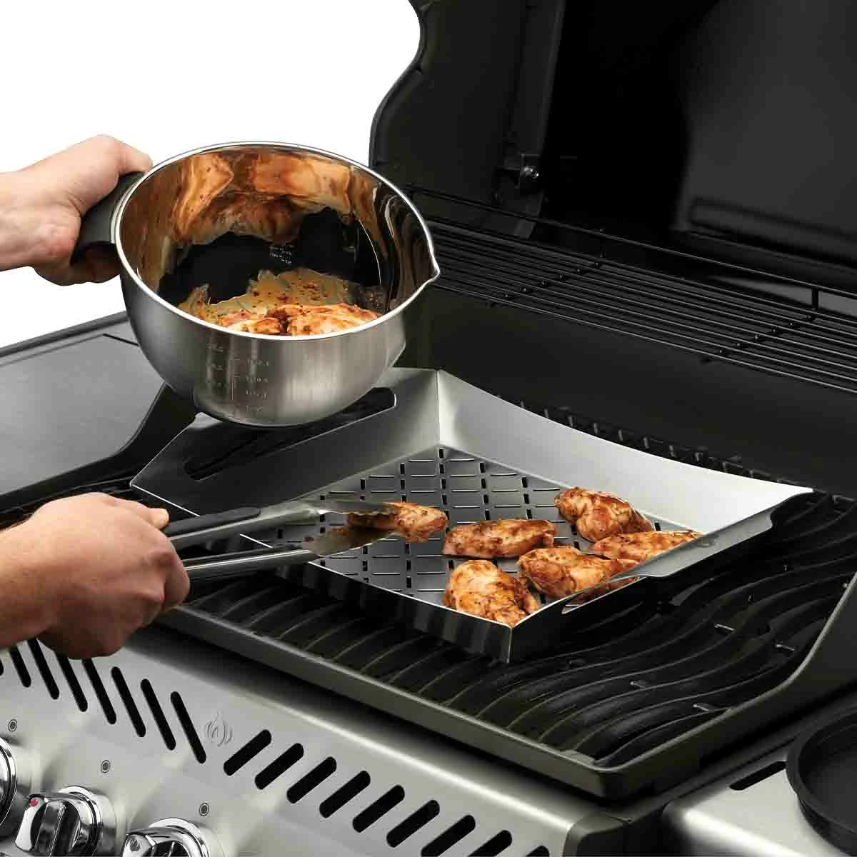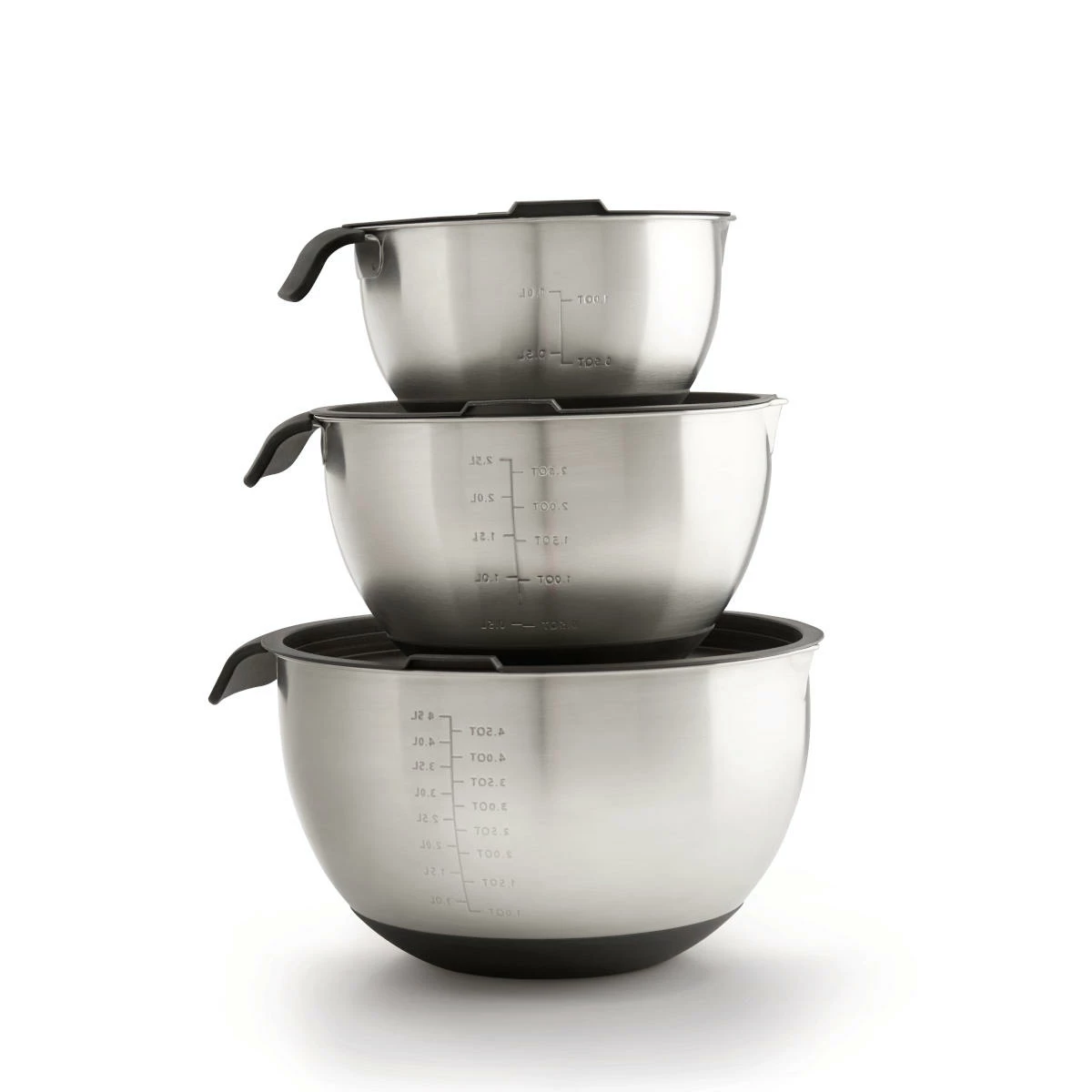 Die Edelstahlschalen in drei Größen sind drei praktische und stilvolle Helfer in der modernen Grillküche. Metrische (Liter) und imperiale Maßeinheiten findet Ihr innen gut lesbar, luftdichte Deckel halten Eure Lebensmittel frisch. Mit Silikon an Griffen und Schüsselunterseiten lässt sich sicher und ohne Verrutschen arbeiten, der Ausgießer erleichtert das Umfüllen der Zutaten.
