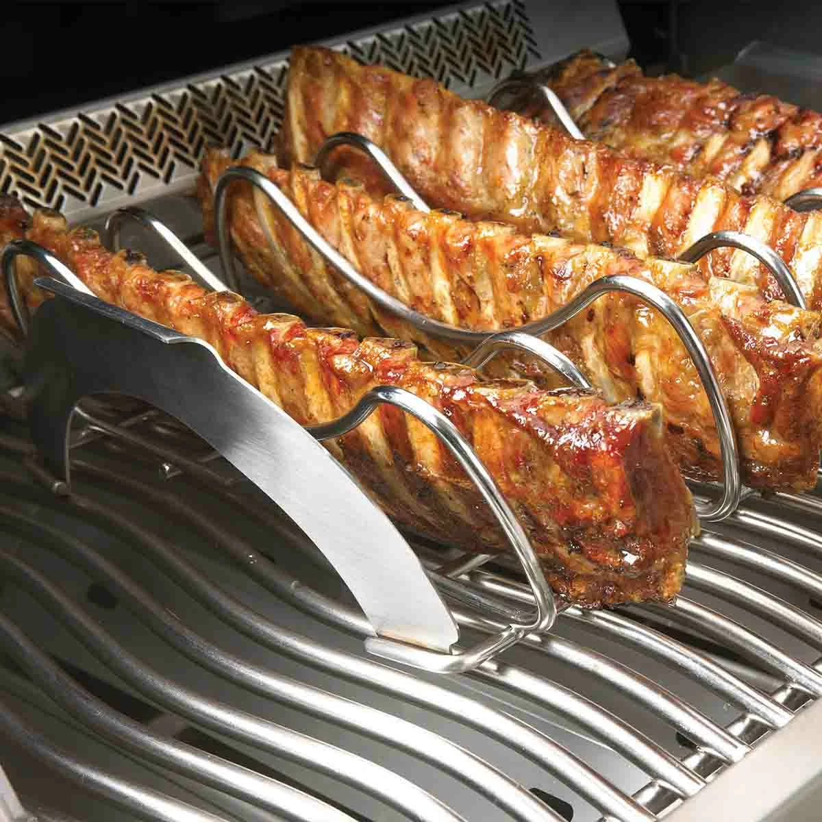 Der Napoleon PRO Spare-Rib- und Bratenhalter aus Edelstahl begeistert durch seine Funktionalität und sein Design. Durch seine elegant geschwungene Form nimmt der PRO Spare-Rib- und Bratenhalter locker sechs Rippenstücke oder einen riesigen Braten auf. Dank der seitlichen Griffen lässt er sich kinderleicht tragen und direkt am Tisch präsentieren.