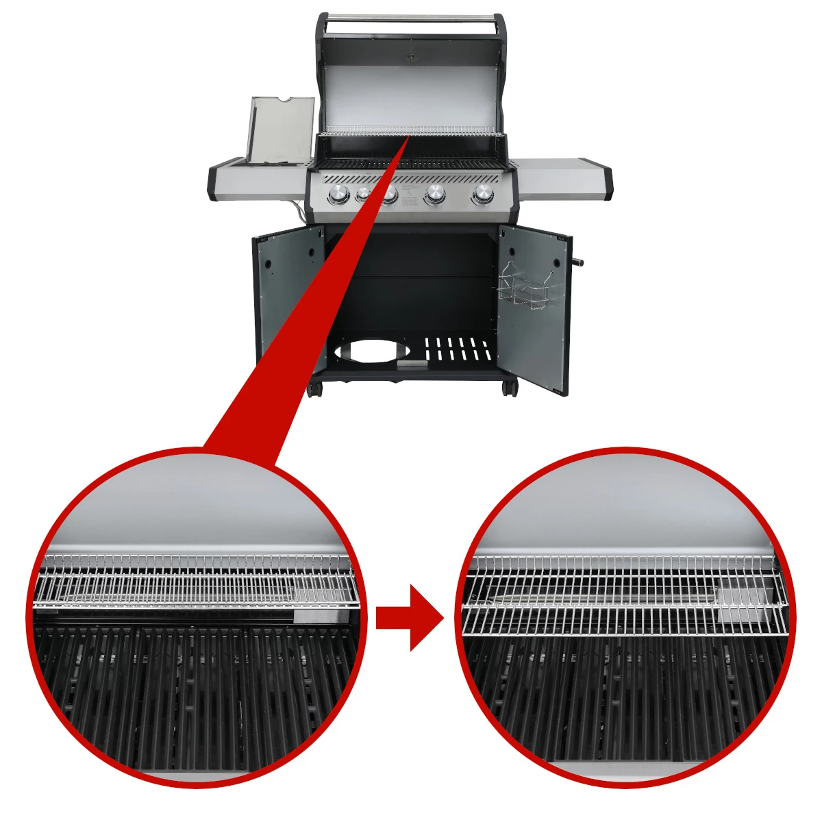 Das Warmhalterost ist ausziehbar, wodurch sich die Fläche im Handumdrehen fast verdoppelt. Das Warmhalterost lässt sich von ca. 14 cm auf ca. 24 cm in der Tiefe ausziehen. Darauf findet jede Menge Grillgut Platz. Ebenso lassen sich Würstchen oder sogar ein ganzes Roastbeef auf dem großzügigem Warmhalterost indirekt garen.