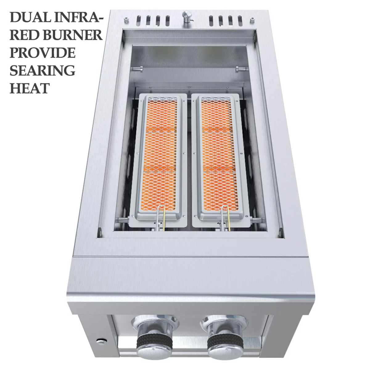 Ergänzend zu Eurem Grill lässt sich der Dual-Infrarotbrenner mit LED-Bedienfeldbeleuchtung optimal in die Arbeitsfläche Eurer Außenküche integrieren. Mit dem multifunktionalen Companion Pro könnt Ihr grillen, braten, räuchern, frittieren und dämpfen. Je nach Geschmack, könnt Ihr den Brenner individuell verbauen – mit Unterschränken ergänzen oder um eine Schublade erweitern.